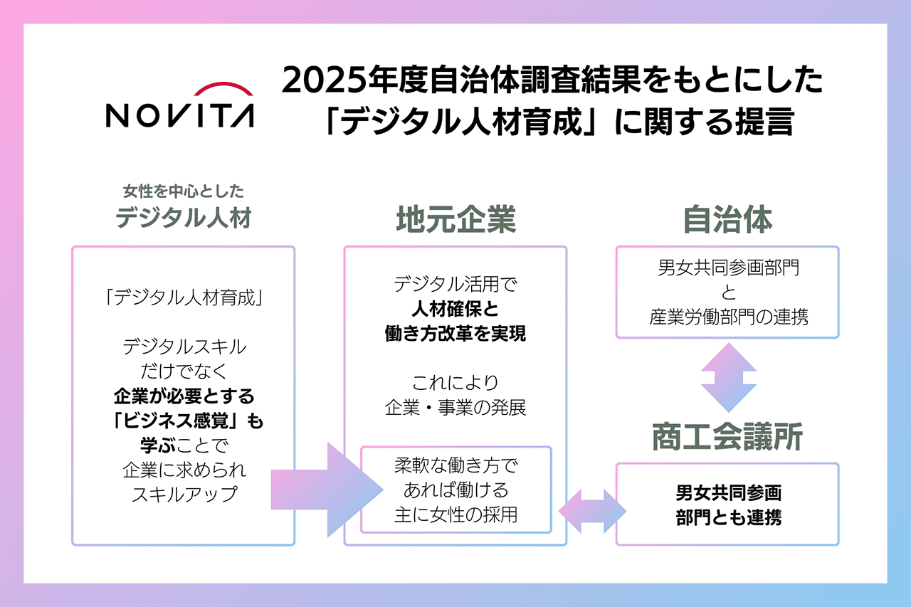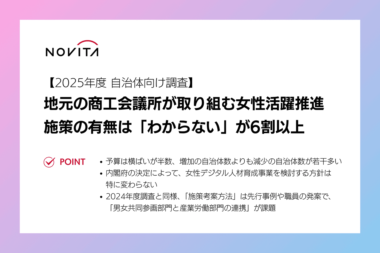 ノヴィータ自身が女性デジタル人材育成の講座提供を行っていることと、また中小企業として自社の「生産性向上・事業成長・働き方改革」のいずれにも良い効果があるように取り組んできた経験をふまえ、各地域で「女性デジタル人材の育成」の事例をさらに増やせるよう背景を探るために、男女共同参画関連部署のある45自治体を対象に、女性活躍支援に関する調査を行いました。