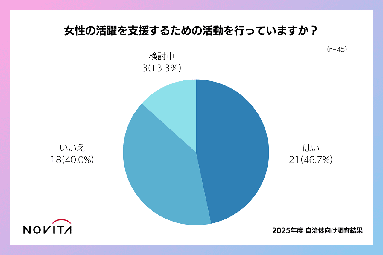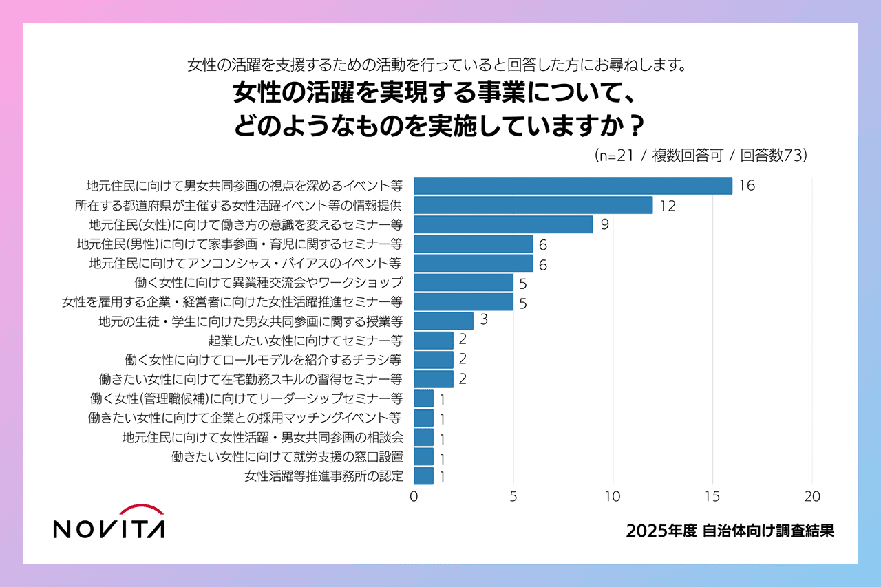 WebやICTを活用し、多様な働き方の実現を支援する地域共創事業などを行う株式会社ノヴィータ(所在地:東京都渋谷区、代表取締役:三好怜子、以下ノヴィータ、https://www.novitanet.com/ )は、全国の45自治体に向け、女性活躍支援や、男女共同参画の取り組みについて調査を実施しました。